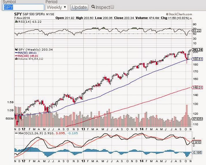 Na následujícím grafu máme stejn opět SPY, ale na týdenní bázi: