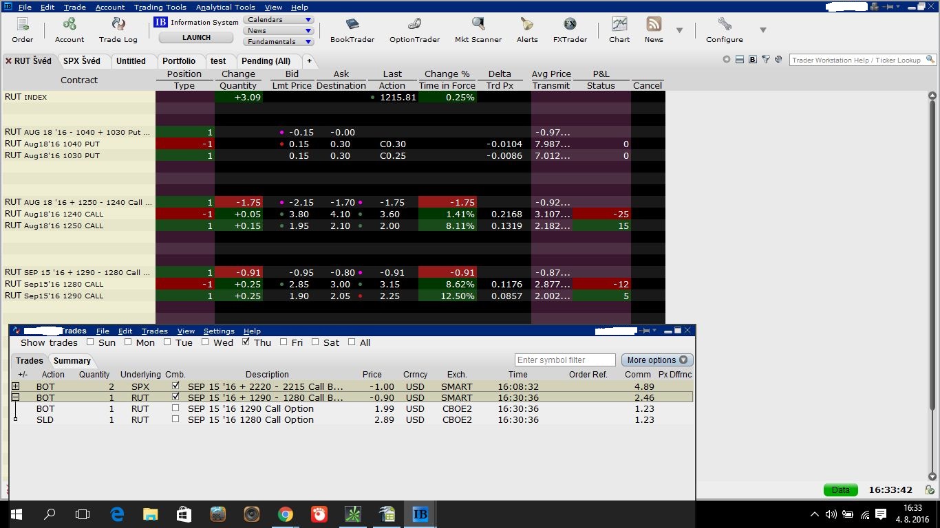 Kromě obchodu v SPX otevíral Švéd také vertikální call spread v RUTu, což jsem samozřejmě otevřel rovněž. Švéd inkasoval za tento obchod 95-100 $, já se spokojil s 90$.