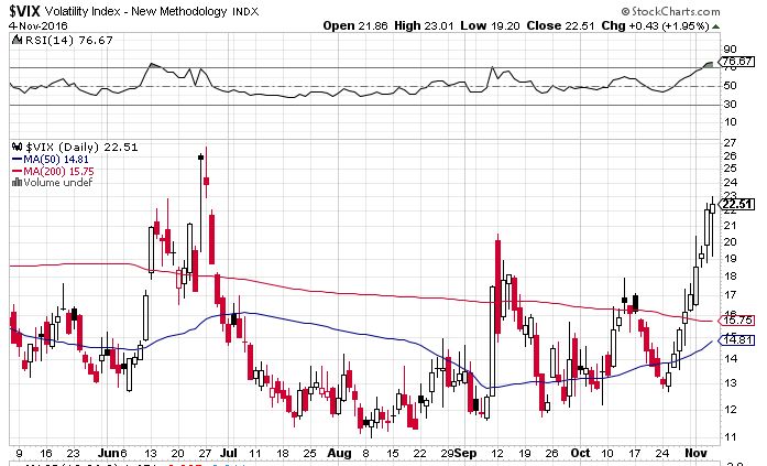 | VIX nám před volbami pochoduje do kopce 🙂 (zdroj: stockcharts.com) |